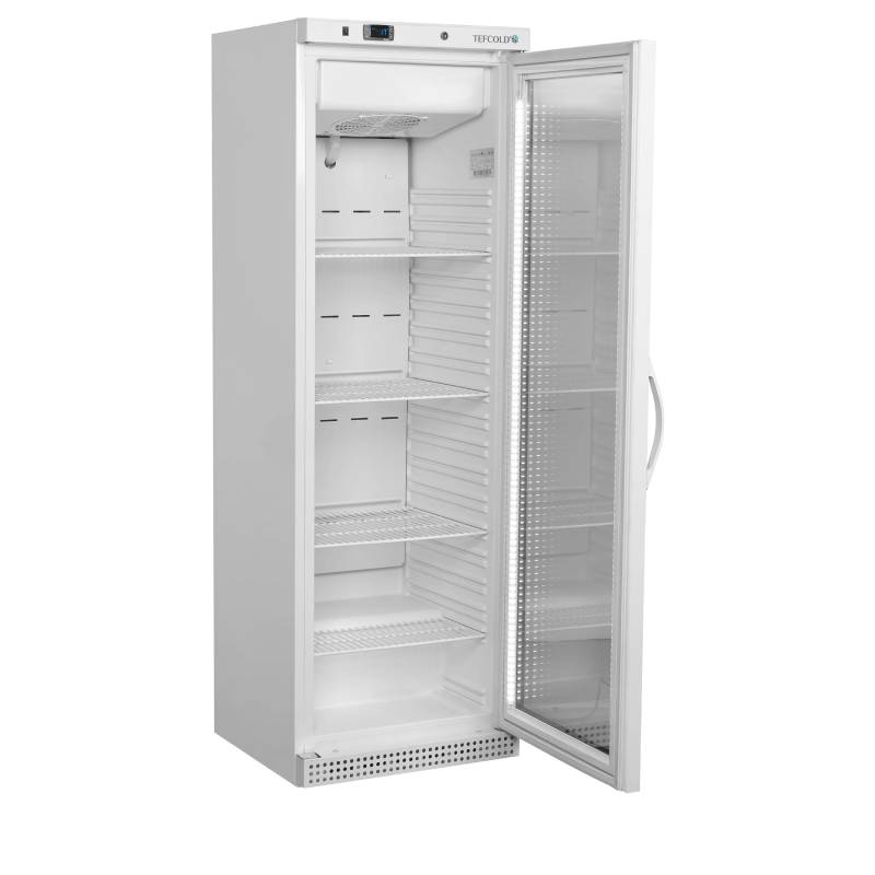 Displayfrys UF400VGW från Tefcold har uppvärmd glasdörr, elektronisk termostat, automatisk avfrostning, ställbara hyllor, justerbara fötter med rullar baktill, invändig LED-lampa, ventilerad kylning och lås.